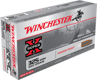 Winchester factory loads for the .325 WSM include a 180-grain Ballistic Silvertip bullet and a 200-grain Accu-Bond bullet in their premium Supreme ammunition line. In their standard Super-X range, they offer a 220 grain PowerPoint bullet.